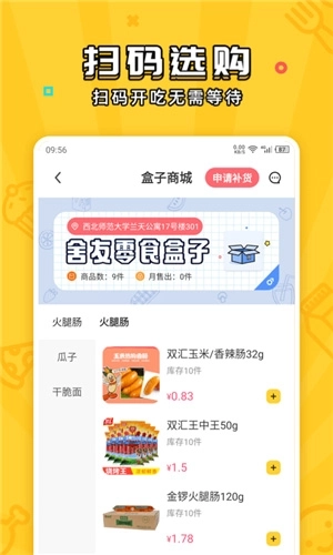 舍友零食盒子是一款由甘肃瓜牛电子商务有限公司研发的自动售货软件,拥有超级多的零食,你只要扫码付款,完成支付后就可拿走零食,晚上再也不怕饿肚子了。除此之外,你还可以与校友进行交流讨论,分享趣事,认识更多新朋友。物美价廉懂你所爱,扫码开吃无需等待。感兴趣的用户不要错过这款软件,快来体验一番吧!