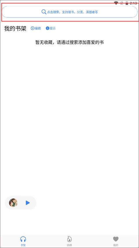 打开后默认进入【书架】界面,在顶部的搜索框里输入关键词进行搜书。