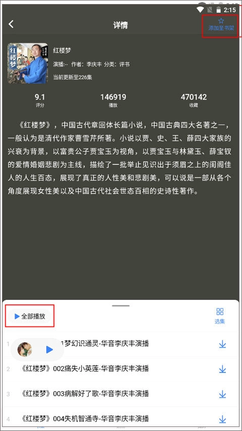 在书籍详情页,你既可以点击左下角的“全部播放”功能,也能选择“添加至书架”选项。
