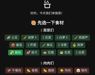 1、帮助用户们进行菜谱筛选的软件,选择手上有的食材和烹饪工具。