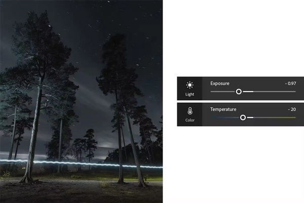 降低曝光度和温度以创建黑暗、凉爽的场景。