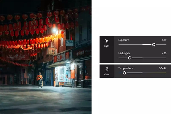 通过调节曝光度与高光参数,在保留亮部细节的前提下提亮暗部区域。利用温度调节滑块修正城市灯光呈现出的橙色色偏问题。