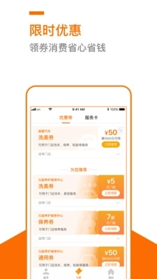3、汽车服务相关的优惠卡券支持在线领取,涵盖洗车券、美容券以及通用券等多种类型。