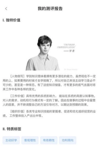 特质标签,是依据测评结果为你生成的标识,涵盖主动好学、客观理性等方面。