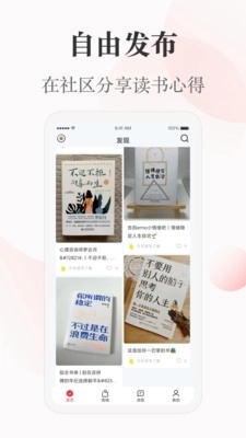 1、用户可自由在社区发布自己喜欢的图书和读书视频,分享自己的读书心得及好。