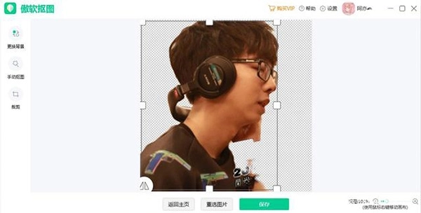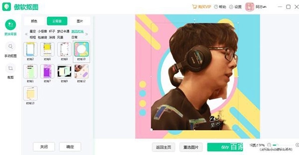 4、抠图完成后,可通过左上角的选项更换背景,也能直接保存透明背景的图片;在成功去除图片背景后,还可以选择“更换背景”功能来设置新背景。