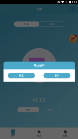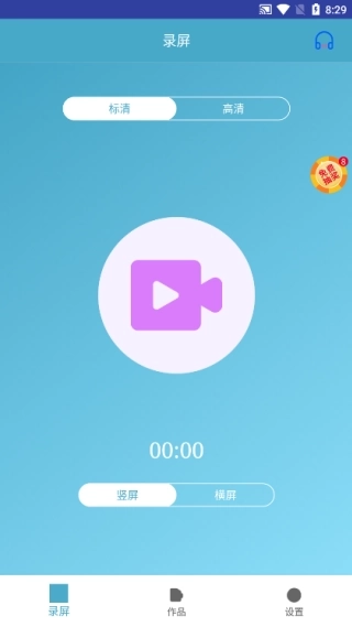 1、打开软件后,在录屏页面可随时进行录屏操作,该功能支持竖屏与横屏两种录制模式,同时具备标清和高清录制选项。