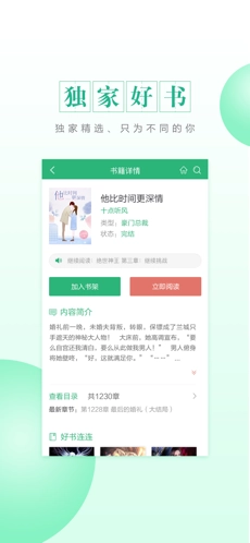 1、海量小说资源:百万部小说任你畅读,涵盖玄幻奇幻、都市言情、武侠仙侠、青春校园、穿越架空、惊悚悬疑、历史军事、耽美同人、官场权势、职场竞技、科幻灵异、经典图书等丰富品类,各类题材一应俱全;尤为贴心的是,阅读全程干扰,带来超一流的阅读体验。