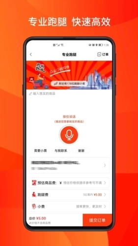 2、专业跑腿:用户在此页面输入想买的商品,需要支付跑腿费,选择就近购买或指定地址购买,提交订单后,会有专业的跑腿人员为用户提供购买服务。