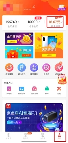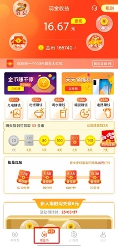 1、在领金币中,可以通过充电赚钱、吃饭赚钱、喝水赚钱、睡觉赚钱、走路赚钱,还可以通过签到等;