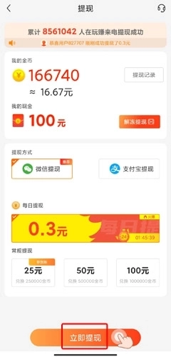 2、可以通过提现方式和提现金额,点击立即提现按钮就可以了。