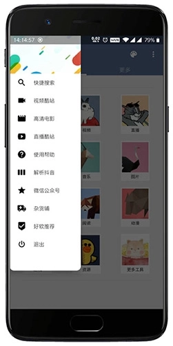 进入软件后点击右上角的“H”展开工具,里面包含了视频、直播、电视、音乐、图片、小说、漫画、游戏、资源、更多十个分类,比如点击“视频”即可进入目前国内所有主流的视频网站,所有VIP视频都可以在这里免费观看。