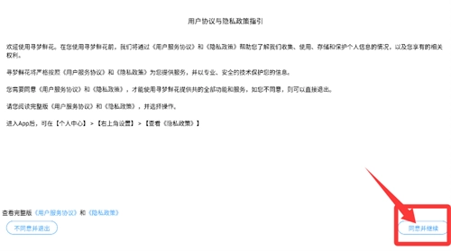 启动应用后,请阅读用户协议和隐私政策,随后点击“同意并继续”按钮。
