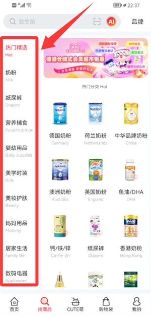 主界面左侧设有热门精选、奶粉等分类,点击分类即可浏览相关商品。
