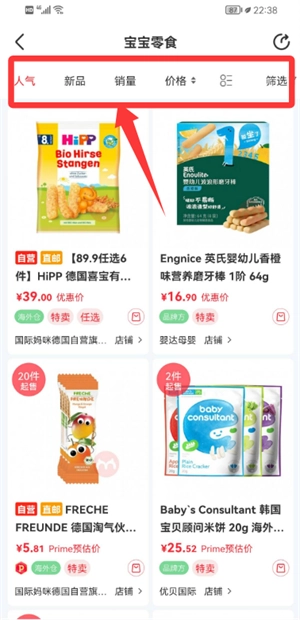 当进入宝宝零食这类具体商品品类时,能够按照人气高低或者销量情况来筛选想要找的商品。