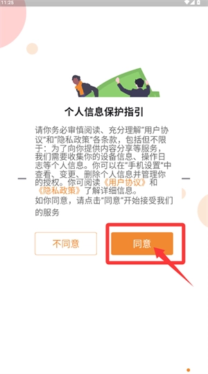打开应用后,在个人信息保护指引页面,仔细阅读相关条款,随后轻点同意按钮。