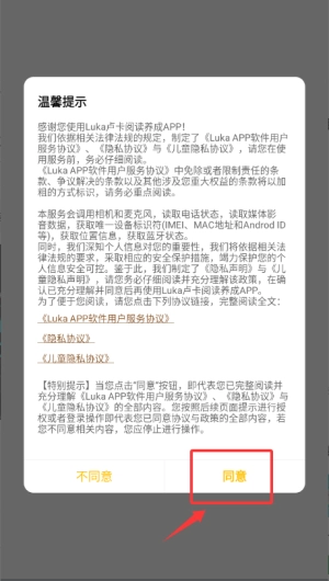 打开Luka阅读养成应用,认真阅读并确认温馨提示的内容,随后进入账号绑定页面。