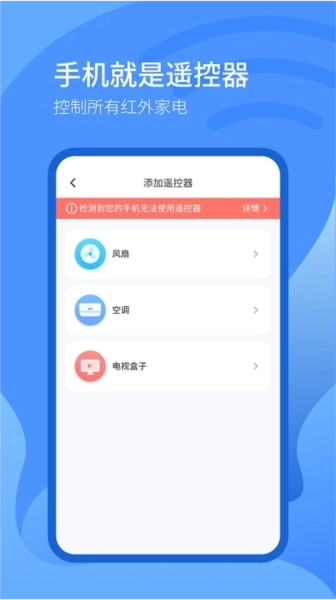 万能遥控器+操作方便高效,可帮助用户控制大部分电器,适用范围广泛,支持多个品牌设备的遥控。使用手机即可遥控电视、空调、风扇、机顶盒、网络盒子等设备,匹配快速准确,功能齐全。所有智能手机均可使用,通过wifi实现遥控功能,无需对准,随时随地掌控各种设备。集合多个智能产品的掌上控制功能,让智能生活更加便捷。