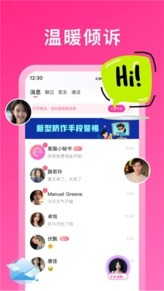 智能匹配:心心相伴采用先进的算法,能够精准匹配志同道合的朋友,无论是视频聊天还是语音通话,都能找到最合适的伴侣。