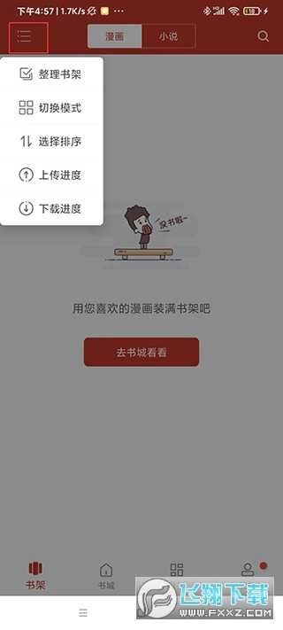 2、左上角为书架管理选项,支持对漫画进行整理和排序;