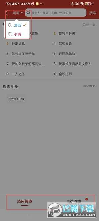 3、右上角为搜索入口,支持站内外搜索,还可分别查找漫画或小说;