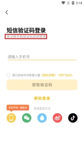 打开后可以直接输入手机号进行短信验证登录,未注册的手机号将会在验证后自动登录。