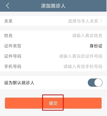 3、在添加就诊人页面填写相关信息后,点击提交按钮即可完成操作。