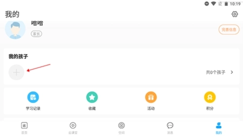 1、打开软件完成注册登录后,进入“我的”页面,找到“我的孩子”板块,点击其下方的+号按钮。