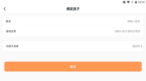 2、进入界面后,填写孩子的姓名与身份证信息,选择您和孩子的关系,最后点击确定按钮,就能完成绑定操作。