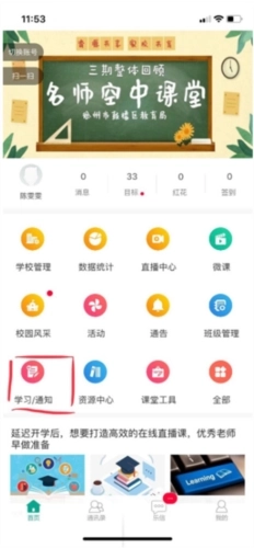 1、通过相同程序进入通知/作业板块,在课程学习启动后,就能查看班级学生的相关情况了。