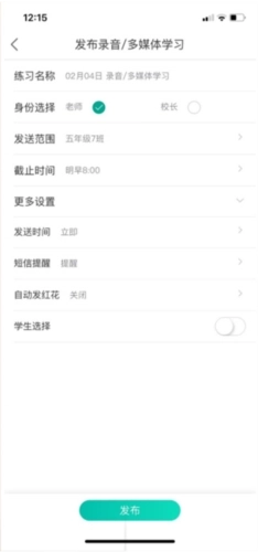2、老师依据年级课程表,在课程开始前30分钟推送学习任务(支持提前设置发送时间)。