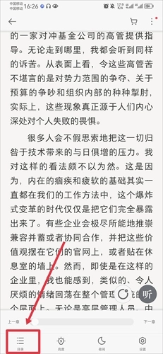 3、如果处于阅读界面,可点击屏幕,待菜单栏目显示后,点击左下角的目录选项。