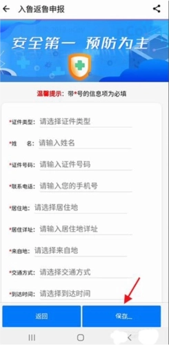 进入入鲁返鲁申报页面,填写相关信息后,点击下方的保存按钮即可完成操作。
