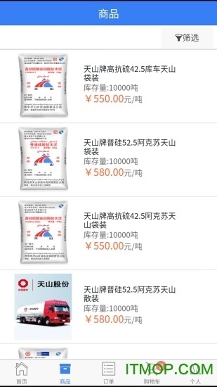 智能商品筛选:可从区域、品牌、标号(例如P.O 42.5、P.C 32.5R)、包装方式(散装或袋装)等多个维度,精准筛选天山水泥的全系列产品。