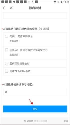 3、填入自己的个人信息,选择要加盟的项目,最后点击提交。