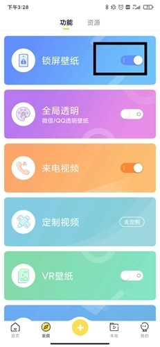 首先我们打开熊猫动态壁纸安卓版,接着进入发现功能分区,在该区域找到一个开关处于开启状态的壁纸设置栏,点击关闭开关,这样就能取消我们之前设置的壁纸了。