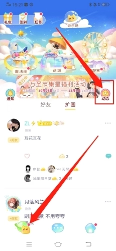 1、进入后,先点击左下角的按钮,接着点击页面中间偏右位置的“动态”选项。