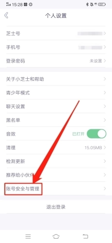 2、向下滑动个人设置页面,在页面最底部找到并点击“账号安全与管理”选项;