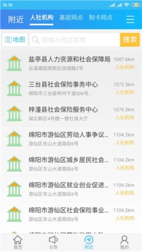 4、点击附近,可以查看绵阳市内各个社保服务中心