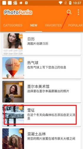 1、首先打开photofunia雪地写字软件,我们可以点击首页的雪征,也可以搜索“雪地”,这两个功能是有区别的;