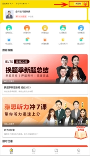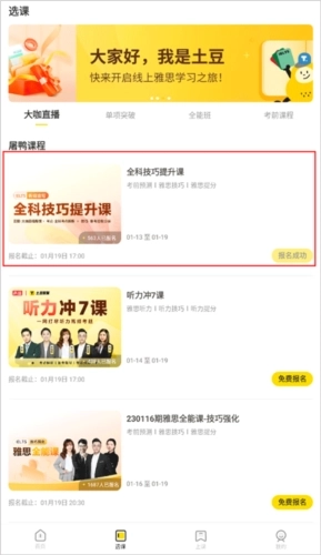 1、首先打开土豆雅思APP,进入选课界面后,找到并点击你已报名的课程。