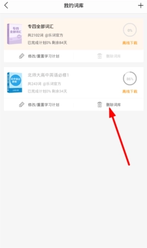 4、在词库页面找到需要删除的课程,点击该课程下方的“删除词库”选项,即可成功删除对应的词库。