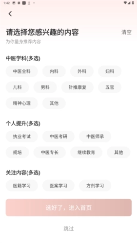 3、选择感兴趣的内容,选择学科、能力提升、关注内容,选好之后就可以进入首页;