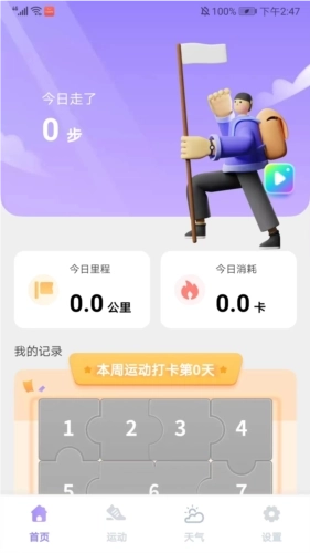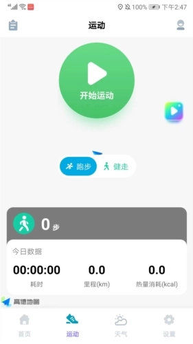 2、进入应用后,界面包含【首页】、【运动】、【天气】与【设置】这些栏目,在首页界面里,我们能看到今日的运动里程以及消耗情况。