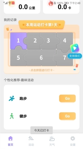 3、向下滑动页面,点击拼图即可完成运动打卡,同时还能参与系统推荐的跑步与健步活动。
