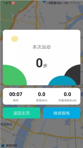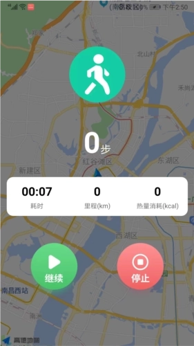 5、能够查看当前运动所花费的时间、运动的里程数以及消耗的热量,并且可以依据自身需求来选择继续运动或者停止运动。