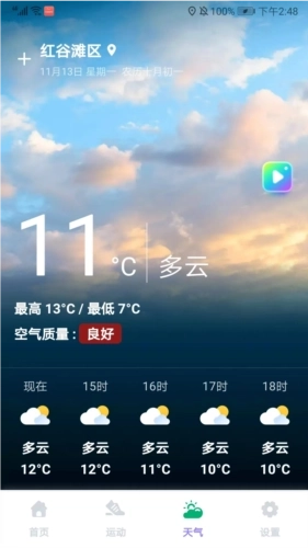 7、进入天气界面后,能看到当前位置的最低温度、最高温度以及空气质量情况,这些信息可以为我们制定运动计划提供参考。
