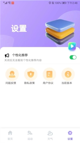 8、进入设置界面后,可看到个性化推荐、问题反馈以及查看当前版本等功能选项,以上便是云彩计步的使用方法。