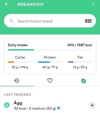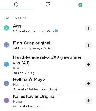 与昨天一样:当你想跟踪与以前相同的食物时,此部分很方便-你可以找到日记中列出的所有食物,并可以通过单击右侧的“+”进行跟踪