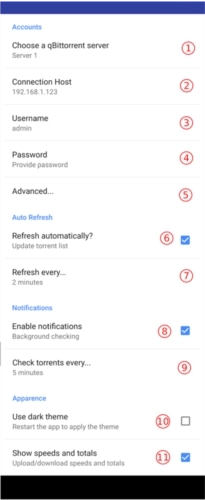 若要开始使用这款应用程序,你可以从左侧菜单栏里选择“设置”选项,以此来配置qBittorrent服务器的相关设置以及账户信息,具体操作如下所示: